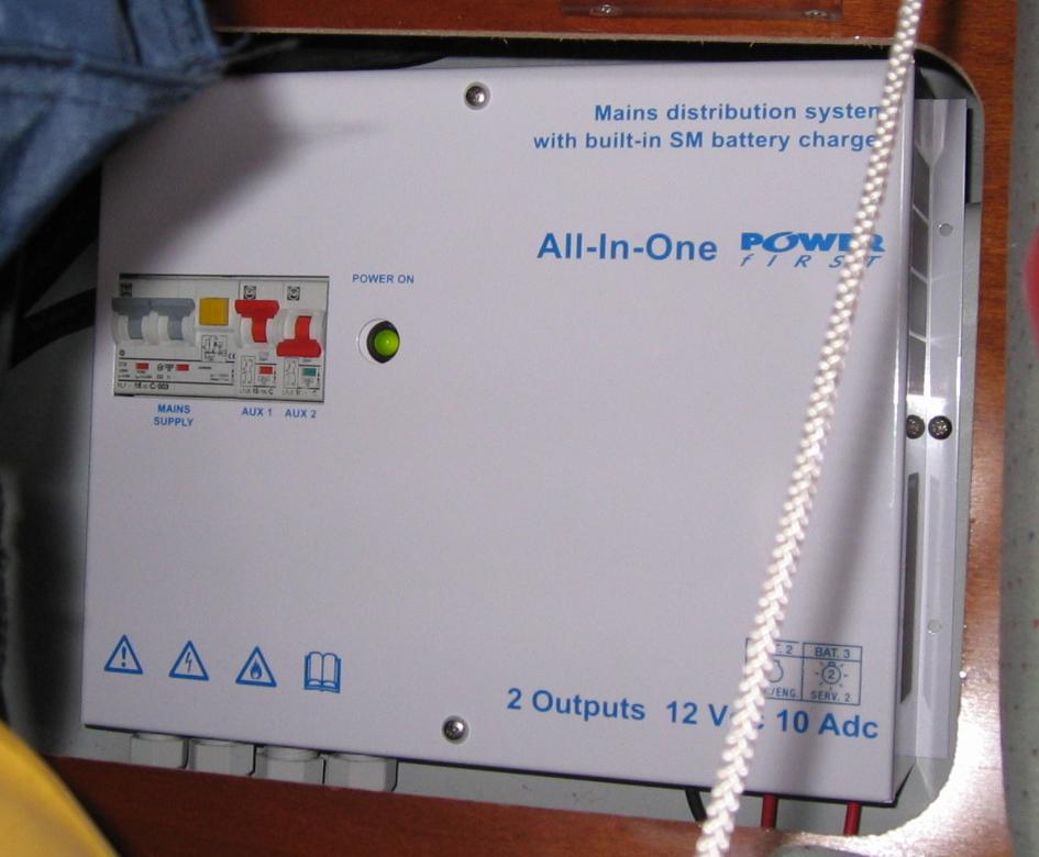 Il y a peu à dire sur le chargeur de quai, on est si rarement à quai. L’Océanis est équipé par défaut d’un All-in-one de 10A. 10Ah, c’est parfait à quai mais trop peu pour que ça vaille le coup de brancher un groupe électrogène dessus.