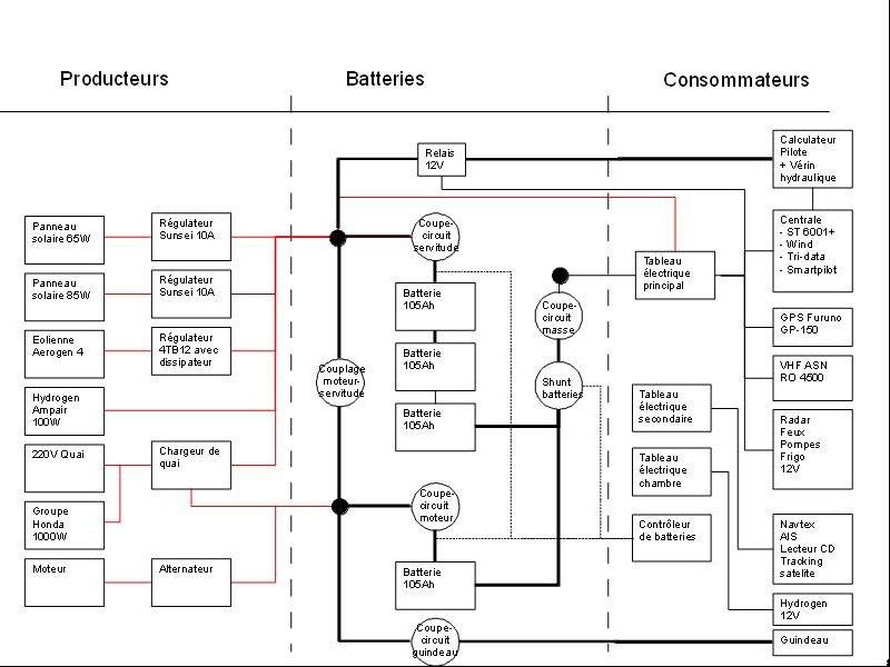 On a d'un coté les producteurs d'électricité (moteur, 220V à quai, panneaux solaires...) et de l'autre les consommateurs (pilote automatique, réfrigérateur, électronique diverse, feux de mats,...). Il faut simplement équilibrer les deux. Au milieu, les batteries qui permettent de tenir quand les producteurs roupillent (ciel gris, sans vent...).
