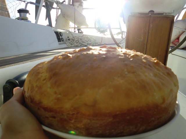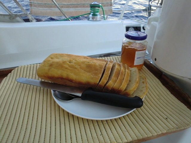 Au petit dej, un café brulant, une tranche de pain et une fine épaisseur de confiture… A la limite on en oublierait le ciel bleu, le lagon et la raie léopard qui a passé la nuit sous le bateau.
