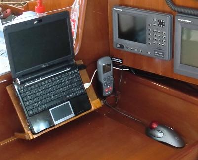 Le PC est relié à l’émetteur-recepteur AIS par une prise RS 232 et un adaptateur USB-RS 232. Les données sont au format AIS pour les informations sur les navires et NMEA 183 pour la position GPS.