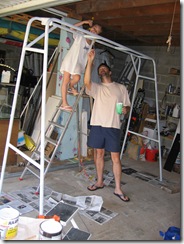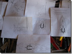 Achat de tube en PVC, d'un gros rouleau de scotch et réalisation d'une maquette grandeur réelle sur le bateau. Ca permet de prendre les vraies mesures, angles et d'estimer le visuel.