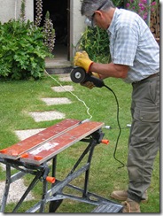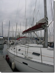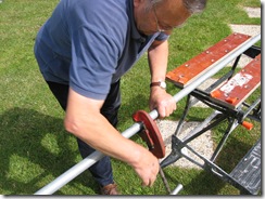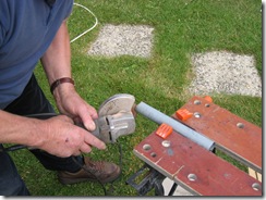 Sur place nous trouvons l'arceau trop haut, et c'est le prétexte à une séance de découpe à la disqueuse sur le ponton. Loin des autres bateau, et en tenant compte du vent pour ne polluer personne avec les particules de fer qui ne manqueront pas de rouiller en quelques jours.