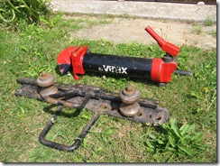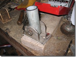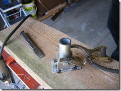 Un tube de 10 cm de tuyau est ouvert à la disqueuse, et refermé au marteau pour donner un tuyau d'un diamètre inférieur sur lequel vont venir s'emboiter et se souder les deux demi-arceaux. La soudure du milieu est lissée à la disqueuse.
