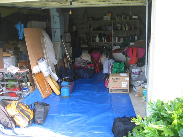 Vider le bateau, tout stocker dans le garage, trier, enlever les étiquettes des boites de conserve qui risquent de se décoller en mer et écrire dessus au marqueur.