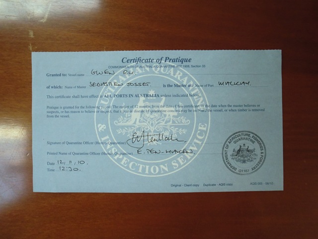 Avant de partir, nous avons fait une demande de visa électronique par Internet, puis avons envoyé un mail aux douanes australiennes. Ce mail donne le nom du bateau, les numéros de passeport de l’équipage, les pays visités précédemment, la date d’arrivée et le port d’arrivée.