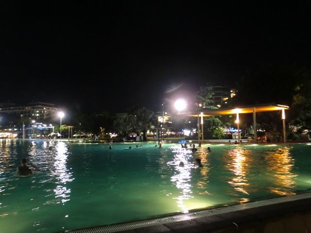 Une fois débarqués de l’annexe, nous traversons un ensemble piscine-résidence équipé d’un ascenseur qui nous dépose à l’entrée de la ville. Cool.