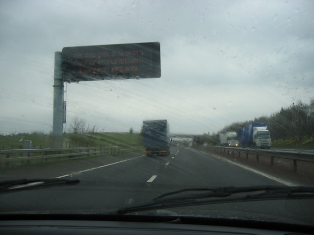 Sur la route il pleut... C'est clair, c'est le Noooord ! Moi, j'ai de la lecture alors c'est tranquille.