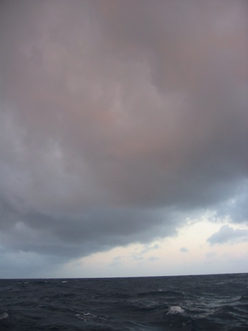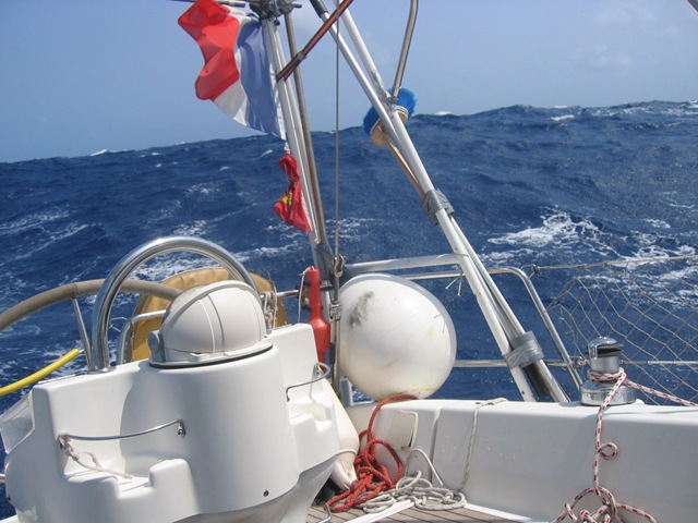 De temps en temps des vagues moyennes s’unissent et je monte des montagnes liquides, par étages. Le p’tit Gwen est à l’aise. Maintenant que je sais le régler, ça avance bien. Juste un peu frustré de toujours naviguer sous-toilé. L’objectif étant de limiter l’usure des voiles et la fatigue du gréement.