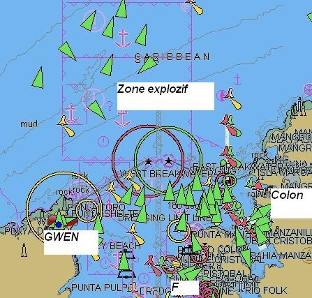 Un petit coup d’oeil sur l’AIS. Gwen en rouge à gauche dans la marina, ses potos porte-conteneur en vert derrière le brise lame, les explosifs hors du brise lame et la ville de Colon ou je dois faire toutes les démarches administratives à droite.