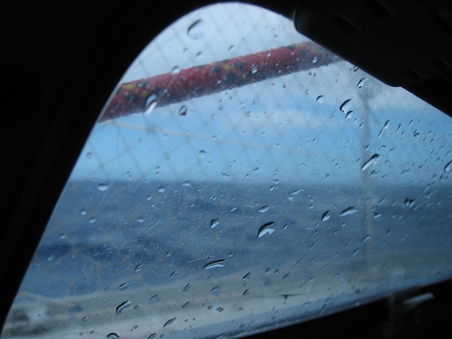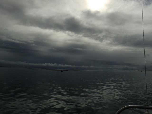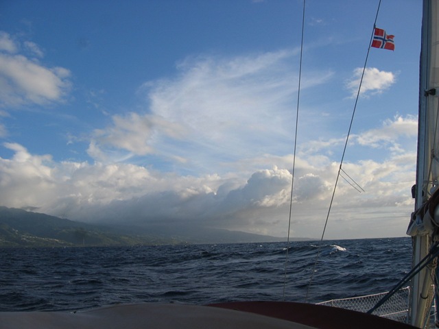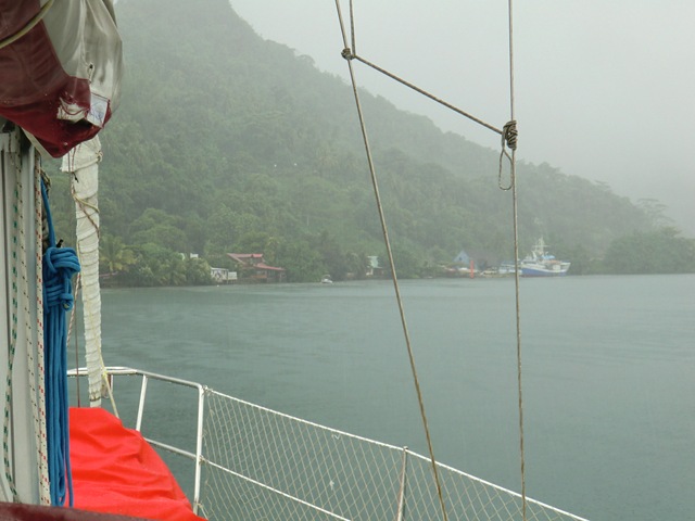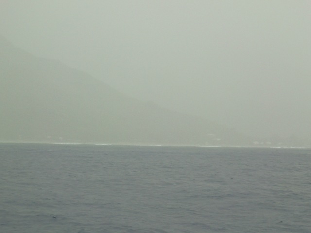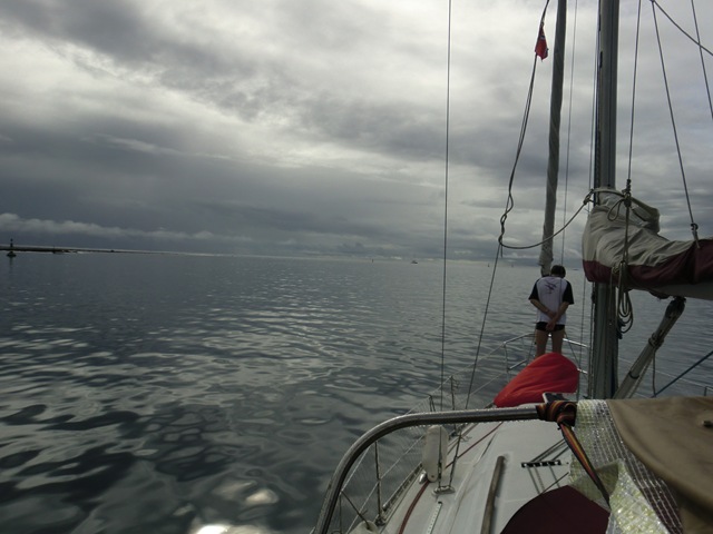 A peine sorti de la passe, ça rebalance du lourd. Pluie, nuages bas, visi nulle et gros vent d’Est, puis Sud. On rentre les voiles et on pousse le moteur. On prend cher… Elles sont ou les vahinées ?