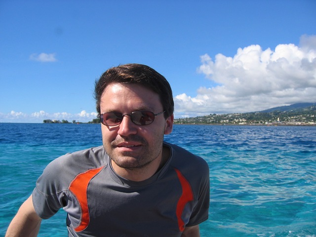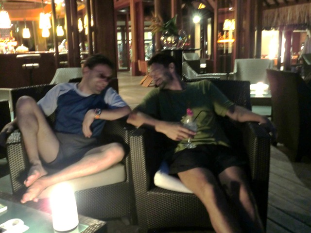 Seb, en tong, une pina colada à la main sur la terrasse du Sofitel :)
