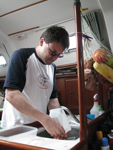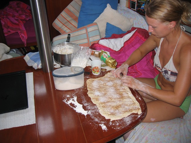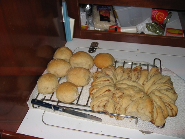 Le moral reste néanmoins au beau fixe à coup de pain chauds, de gâteaux et de bonne musique. Dehors il y a des vagues de 5m, et je me mangerai un vol plané à travers la cuisine, incapable de me tenir tellement la gite était forte.