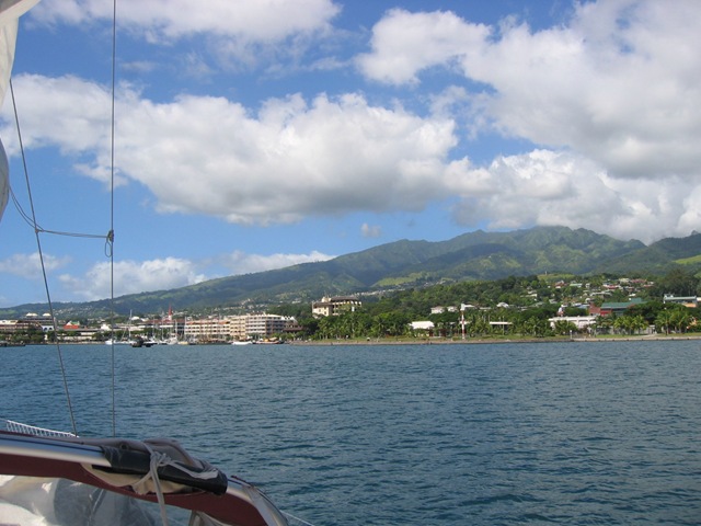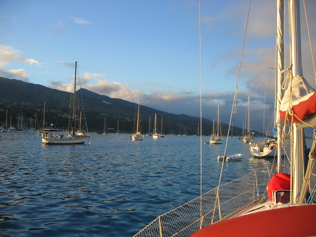 En fin d’après-midi, Tahiti se dessine, et après avoir contourné la pointe Vénus, nous plantons l’ancre à la tombée de la nuit et passons la nuit au calme en baie de Matavai dans 8m d’eau sur du beau sable noir.