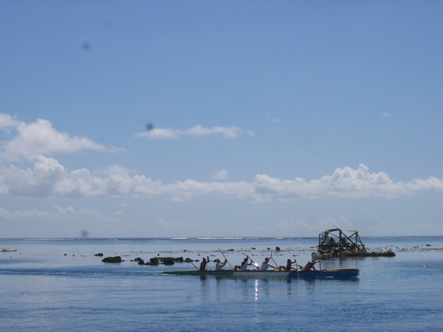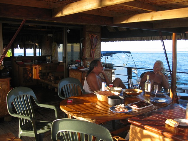 Michel Lecollen, voisin de mouillage avec qui j’ai passé Panama, et ancien charter de Tahiti vient nous chercher pour un repas sur la pirogue de son pote Teki.