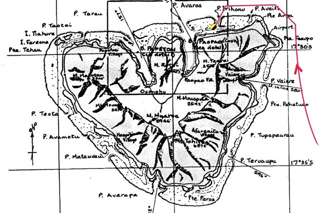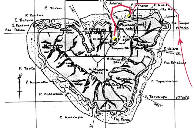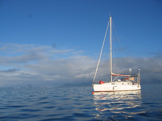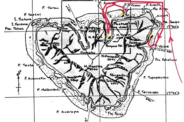 Vaiere, c’est la première baie. Juste en face de Tahiti. On est passé devans tout à l’heure. Il faut faire demi tour, et il est déjà 16h. Dans 2h il fait nuit. On ne connait ni la passe, ni le mouillage.