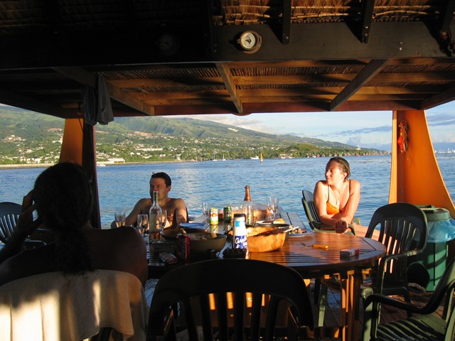 Repas de poisson à la tahitienne, taro, igname… Dans une ambiance cool. La fille de Teki fête son diplôme avec une bande d’amis. Excellent !