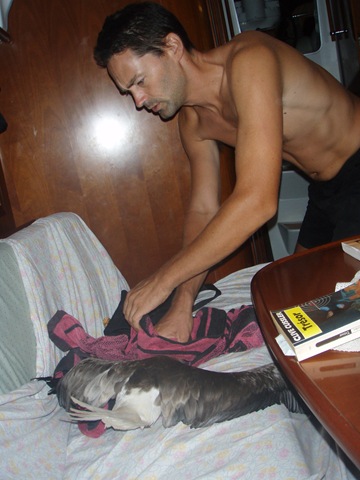 Durant la nuit, un petit canard aux pattes bleues (ou rouges ?) viendra se réfugier dans le cockpit, puis dans le carré. Nous l’appellerons Boobert avant de le remettre dehors à coup de pied dans les fesses. Non mais !